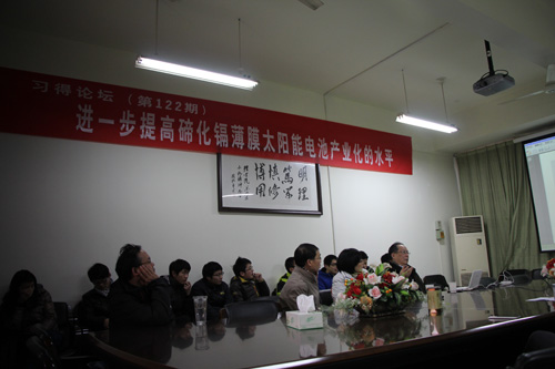 吴选之教授在报告中介绍了当前薄膜太阳能电池存在的问题,分析了进一步提高碲化镉薄膜性能的可能途径,阐述了太阳能电池产业化的发展方向,对我们目前太阳能行业的发展有重要的指导意义。在报告结束之后,吴选之教授等人在物理系系主任潘卫清博士带领下参观了物理系的部分实验室, 并探讨了就太阳能电池技术合作的途径及方式。