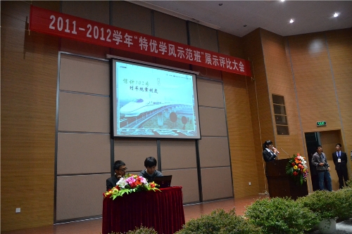 12月6日晚6点, 2011-2012学年校特优学风示范班评比大会在A4-122举行。校党委副书记周加敏出席活动。各职能部门负责人、二级学院学生工作负责人、全体辅导员、20个参评班级及学生代表参加活动。