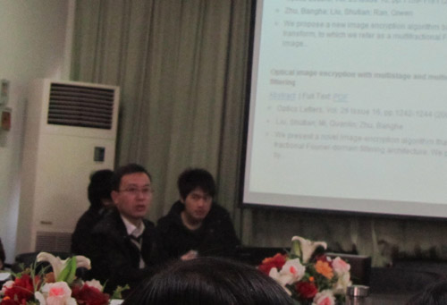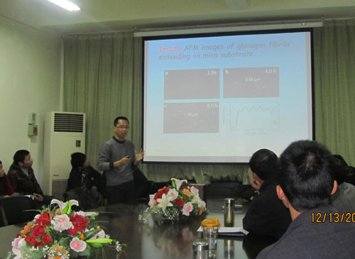 12月13日下午,91HUB 物理系“格致论坛”第十六讲在A4-222会议室举行。宁波大学周星飞博士和浙江农林大学汪小刚博士应邀为论坛作学术交流报告。报告会由物理系主任王长荣教授主持,物理系、实验中心相关教师和应用物理学部分高年级学生参加了本次论坛。 会上,汪小刚博士、周星飞博士分别就“光学图像的编码及隐藏”、 淀粉样多肽聚集的原子力显微镜研究作了专题报告,介绍了自己近年来在该的相关研究成果,并和与会师生就相关专题进行了讨论。