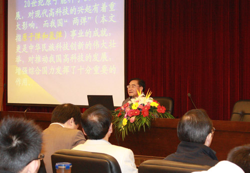 报告会上,郭柏灵院士回顾了我国“两弹一星”事业的发展史,介绍了中国核武器的研制背景、发展历程及“两弹一星”事业取得重大突破的成功经验。他结合自身参与“两弹”研究的经历,用大量感人的事例和图片资料,向师生们介绍了“两弹一星”功勋奖章获得者钱三强、彭桓武、郭永怀、朱光亚、周光召等老一辈科学家在艰苦的条件下发愤图强、锐意创新、无私奉献,克服种种难以想象的困难,最终为“两弹一星”的研制成功做出突出贡献的感人事迹。他激励我校师生,要切实发扬两弹一星精神,投身于我国高科技事业,为国家的发展、民族的复兴作出贡献。