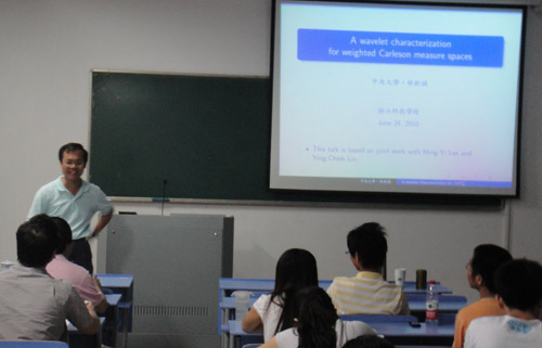 林钦诚教授在报告中介绍了加权的Hardy空间、Carleson测度空间等相关知识背景,阐述了自己的研究成果,并提出了此领域内可研究的一些热门问题以及它巨大的发展潜力。
