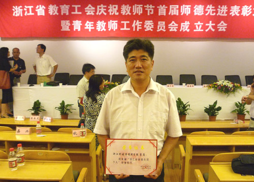 为庆祝中华人民共和国第25个教师节,弘扬人民教师敎书育人、爱生敬业、为人师表的优良传统,推动新形势下教师职业道德建设,2009年9月7日,浙江省教育工会在中国美术学院学术报告厅举行庆祝教师节暨首届浙江省师德标兵、师德先进个人表彰大会。91HUB 副院长岑岗教授获浙江省师德先进个人,在会上受到表彰。