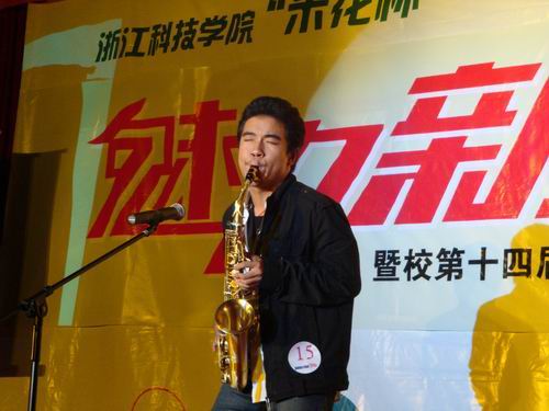 吴钦杰同学从初三开始步入音乐的殿堂,从此与萨克斯结下了不解之缘。虽说是“半路出家”,但如今已是道行高深了。当问到为何对萨克斯情有独钟时,吴只是微微一笑,说:“我选择,我喜欢。”的确,我行我秀。此次参加校“米花杯”新生才艺秀,吴也是有备而来,经过一段时间的刻苦练习,从扣人心弦的比赛中脱颖而出,入选决赛。在决赛中,吴同学手捧萨克斯神态自若,充满自信,俘获了全场观众的心,大家都久久地陶醉在了他的曲声里。在场的评委老师也予以高度评价。