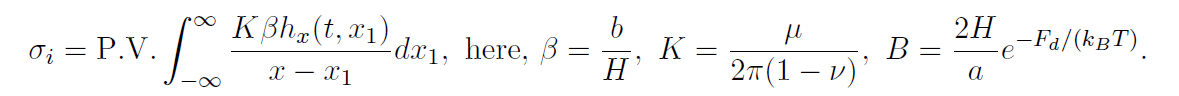 where the unknown function h is the height of grain boundary from reference line, \sigma_i is the stress due to the elastic interaction between disconnections based on their dislocation nature, defined by